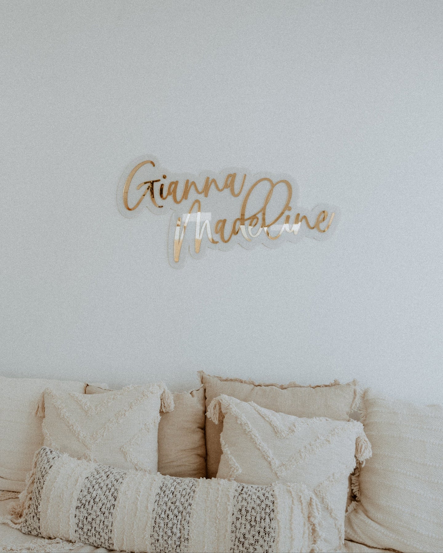 Introducing the Double Layer First and Middle Name Sign! This beautiful, personalized sign is perfect for your nursery wall or as backdrop decor at your next event. Customize it in your favorite fonts, colors and materials. Made to last, it is crafted from high quality wood and acrylic. Get it with or without holes for hanging. Order yours today!